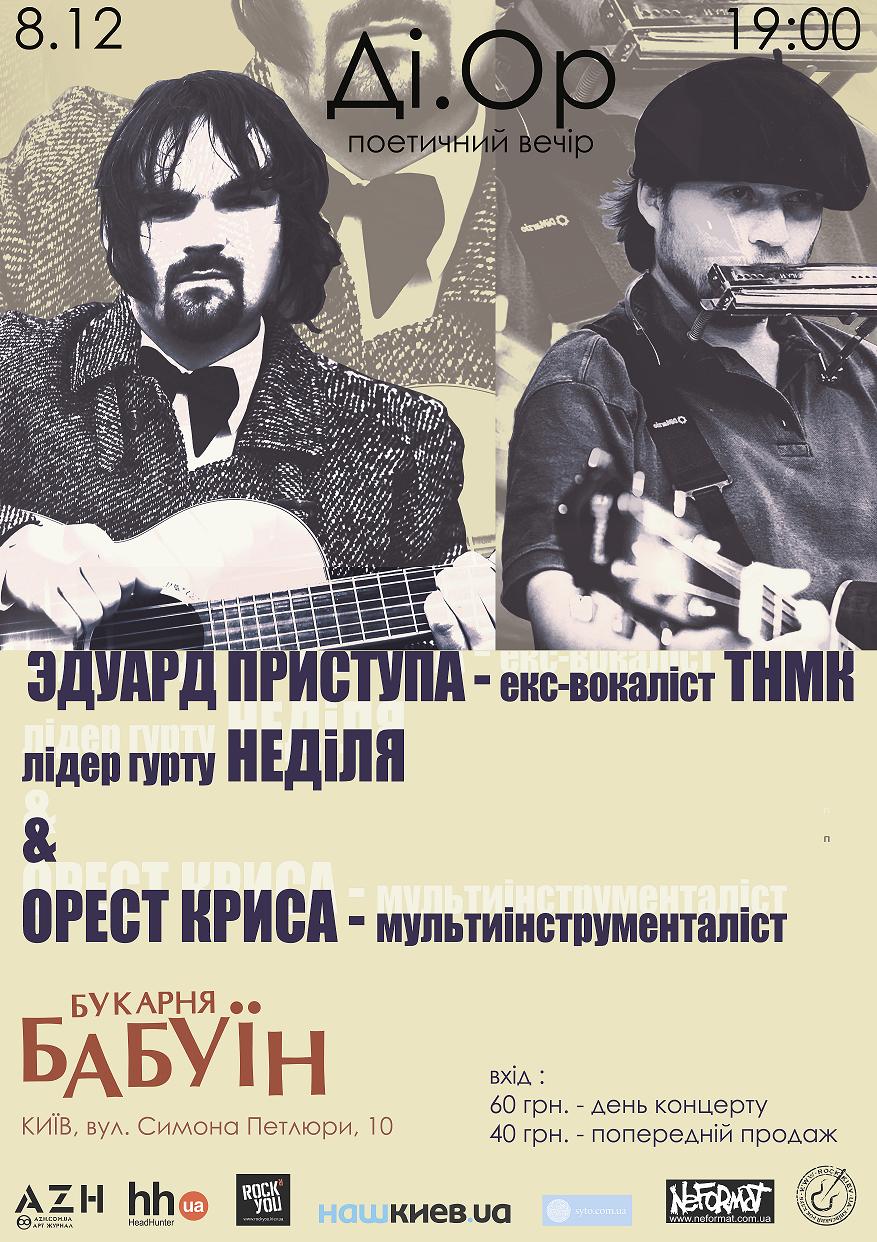 Сольный концерт: київсько-харківський дует Діля і Орест. Концерт складатиметься з 2 відділеннь і буде присвячений українським письменникам... тож, у першому відділенні музиканти представлять абсолютно нову програму: композиції на вірші відомих українських письменників – Богдан-Ігор Антонича, Михайла Яцьківа, Івана Малковича, Ліни Костенко та ін, а у другому відділенні дует зіграє пісні з акустичного альбому "Ді.Ор", а також представить декілька нових творів!